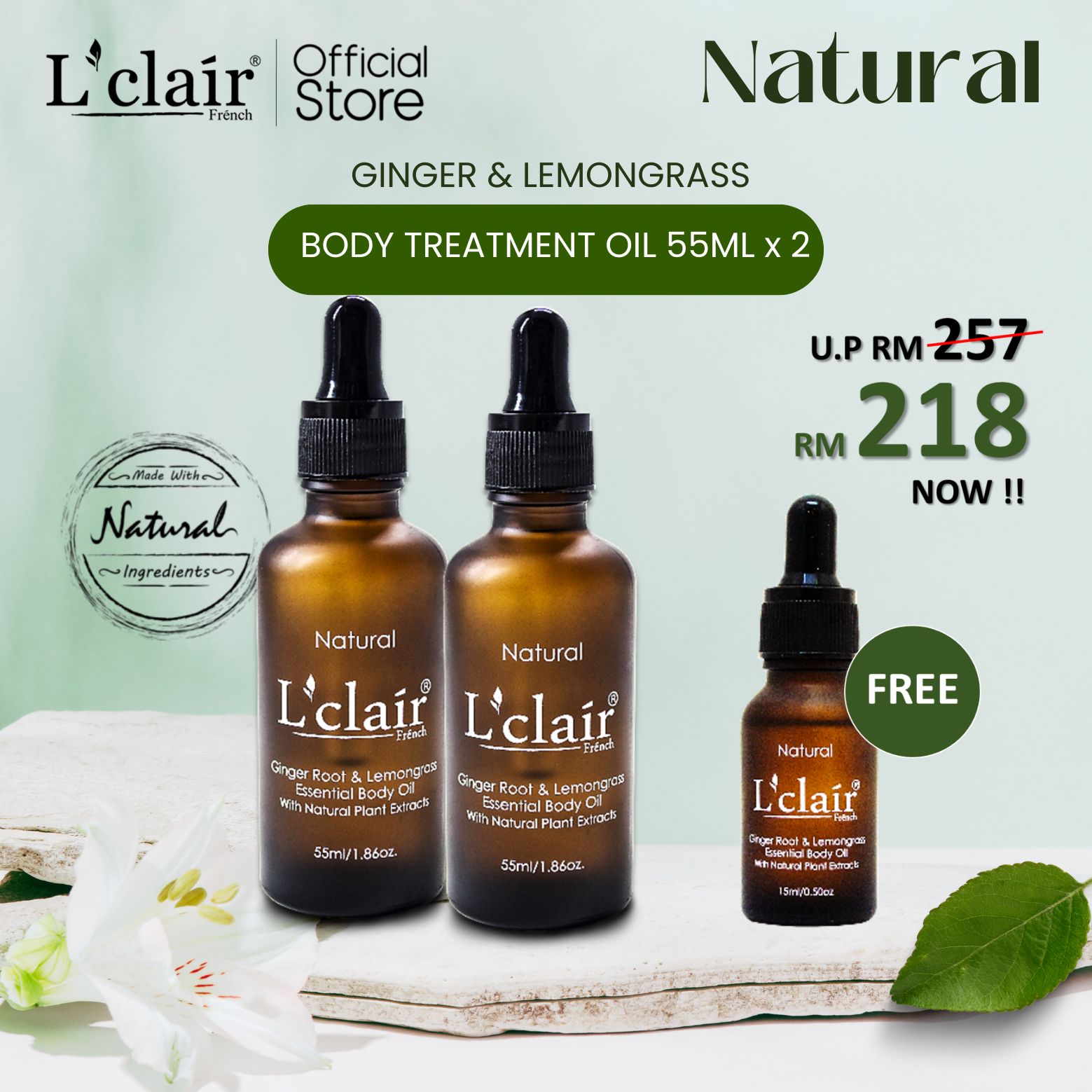 / Lclair Ginger & Lemongrass Essential Body Oil (2 x 55ml) [Free Body Oil 1 x 15ml Worth RM39]